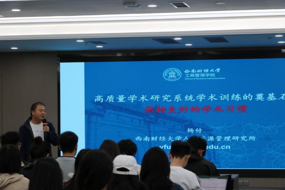 杨付围绕强化系统学术训练、齐思共研交流反馈和培育和谐共进文化三大主线,为同学们带来了一场以“高质量学术研究系统学术训练的奠基石——保持良好的学术习惯”为主题的讲座。通过丰富生动的案例分享和详实有效的方法介绍,他深入浅出地分享培养学术研究基础的经验,并希望同学们继续强化训练,积极与导师和同学交流反馈,从论文选题、文献整理与写作规范等方面不断提升自己,努力养成良好的学术习惯,为高质量的学术研究打下坚实的基础。讲座结束后,杨付还与同学们进行了交流互动。