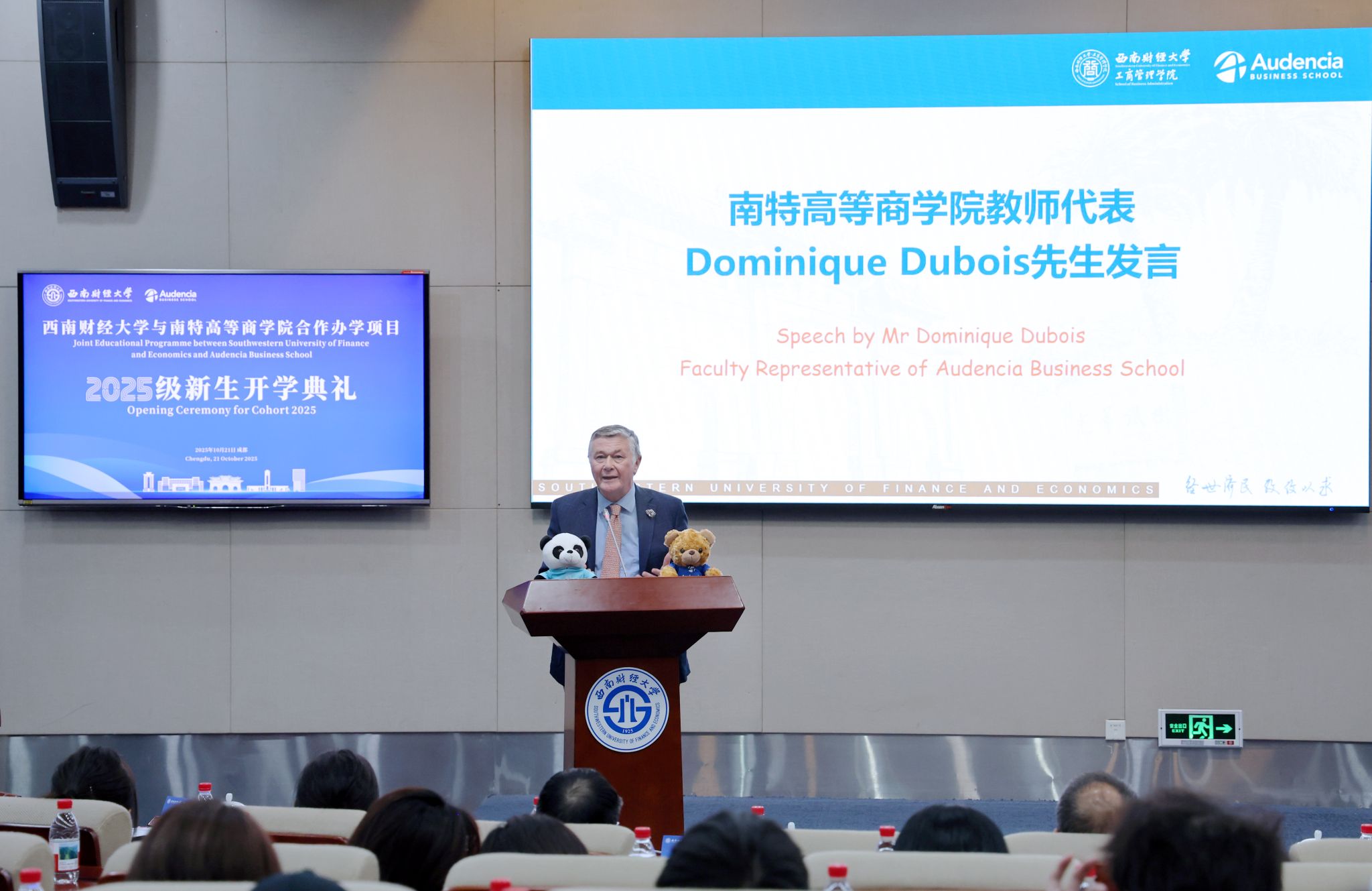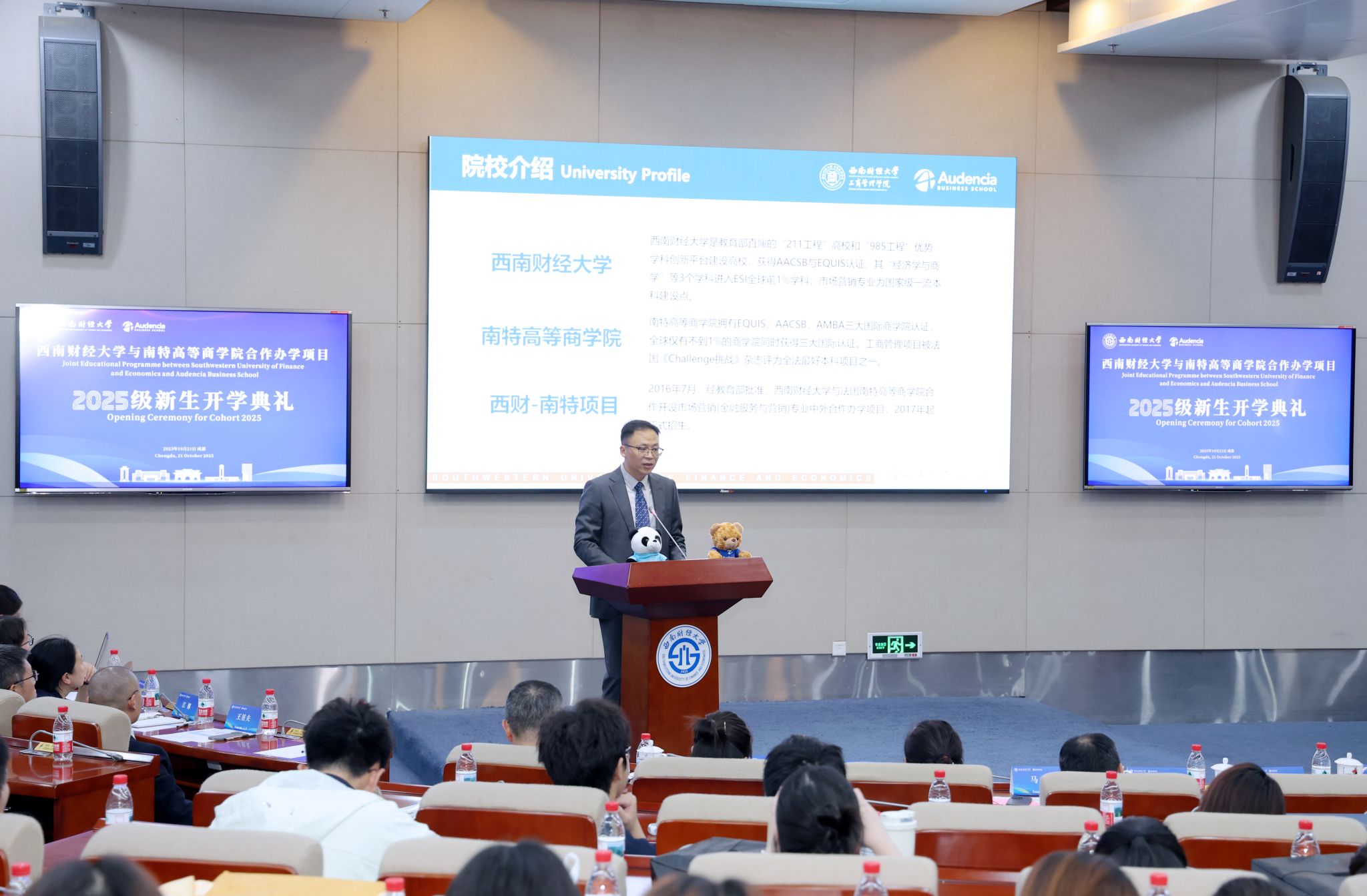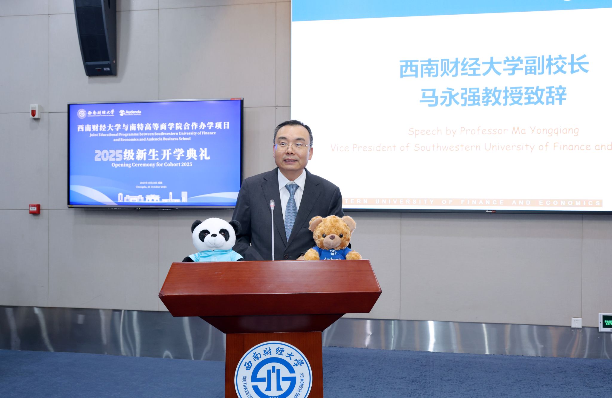 马永强代表学校致辞,向全体新生表示热烈欢迎。他以“双星闪耀,东西辉映”生动比喻两校强强联合,并回顾了西财百年办学历程中“经世济民”的初心使命。他指出,新生们要以全球视野、跨界智慧、智能素养、专业深度与探索精神五大维度赋能成长,努力成长为连接中法、贡献世界的卓越人才。