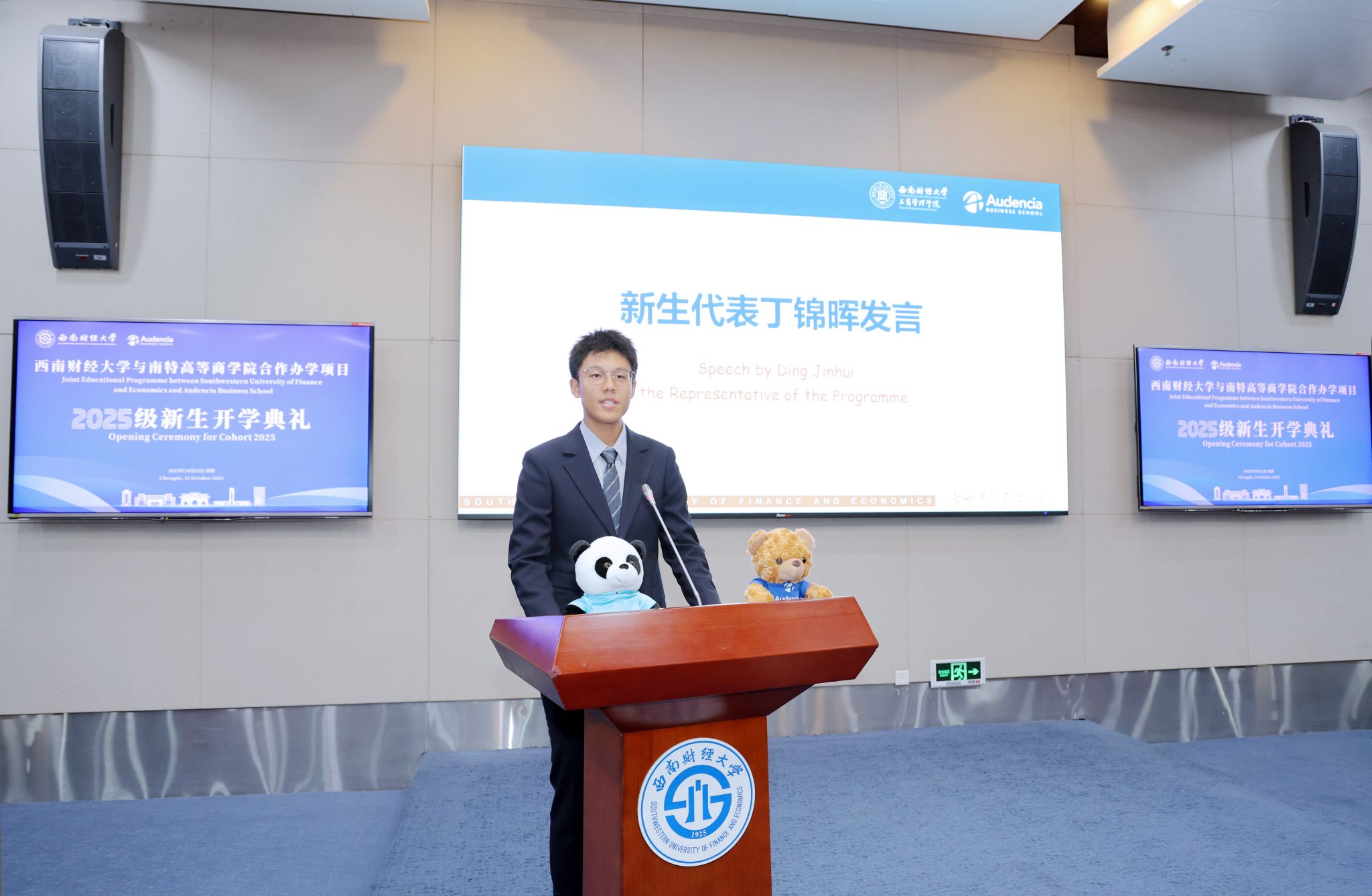 新生代表丁锦晖以“拥抱大千世界,定义璀璨未来”为主题,表达了对即将开启的跨文化学习之旅的憧憬与决心,承诺以主动学习、文化探索、知行合一、身心健康与责任担当书写青春答卷。